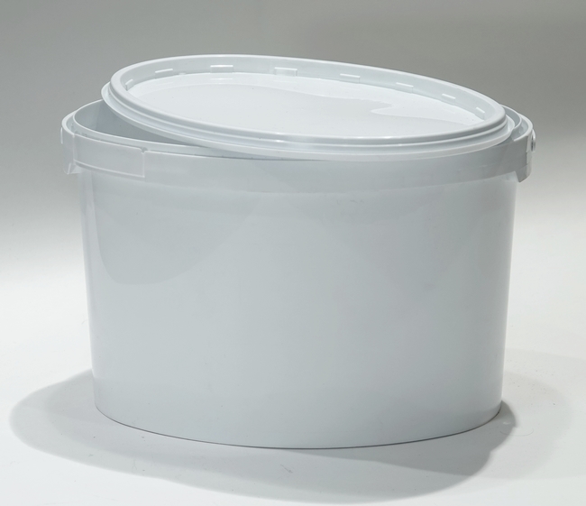 ►6L OvalTainer bucket with lid and plastic handle. Decorated by IML. Weight bucket=300g / Weight lid=65g / Cycle time bucket=11s with iml label and take-off. Resin PP block copo mfi=30.